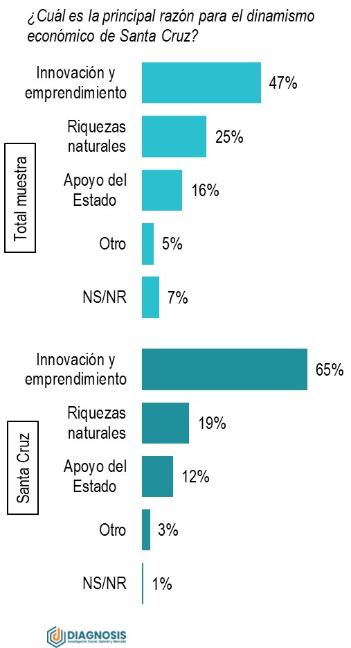 En este aniversario de Santa Cruz, Diagnosis indaga las percepciones de la población sobre el modelo de desarrollo de este departamento y sobre las posiblidades de su aplicación al resto del país. Las clases bajas de tierras altas creen que el dinamismo económico del departamento se basa en sus riquezas naturales y en el apoyo del Estado. En cambio las clases medias; sobre todo las de la propia Santa Cruz, creen que el dinamismo cruceño se debe al emprendimiento de su gente. Estas clases medias de Santa Cruz se sienten ajenas a una "Bolivia andina" con valores comunitaristas a la cual le falta la mirda cosmopolita y los valores asociados a la competencia individual, claves para el desarrollo económico de su región.