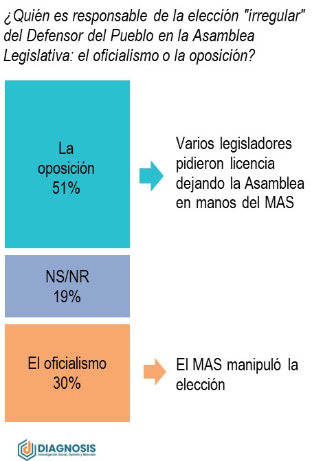 La elección del Defensor del Pueblo en la Asamblea Legislativa en días pasados ha reafirmado la polarización social y política entre sectores populares masistas y clases medias anti masistas. Los primeros justifican la elección, en tanto que los segundos la rechazan por "ilegal" y "manipulada". En esta esporádica repolarización, los sectores opositores al MAS salen debilitados: el 40% de ellos culpa a los asambleistas de CC y de Creemos por licencias injustificadas en la Asamblea, lo que permitió que el MAS concretara la cuestionada elección del Defensor.