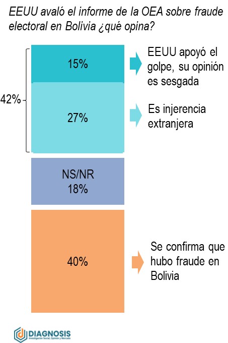 El aval del Departamento de Estado de EEUU al informe de la OEA sobre el proceso electoral del 2019, ha reavivado la polémica y el enfrentamiento entre las narrativas del golpe y del fraude. La posición de EEUU puede ser contraproducente. Según la encuesta de Diagnosis, incluso algunos que apoyan la nartiva del fraude rechazan la "injerencia" de EEUU.