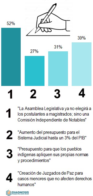 En días pasados el Tribunal Supremo Electoral autorizó a un grupo de jusristas independientes recabar un millon y medio de firmas para viabilizar un Referendo de Reforma de la Justicia. Además la máxima autoridad electoral aprobó cuatro preguntas que serán planteadas a la población en caso de realizarse el mencionado Referendo. En este informe de Diagnosis se presentan las posturas de apoyo o de rechazo de la población frente a estas cuatro preguntas. Mientras la población no comprenda cómo las reformas planteadas en el Referendo van a disminuir la corrupción y la dependencia de la Justicia respecto del poder político, el apoyo a las mismas será limitado, con el riesgo de un voto mayoritario de rechazo.