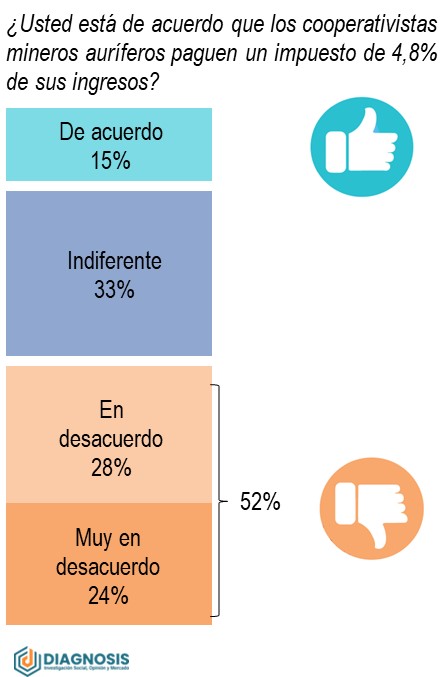 La mayoría de la población rechaza los acuerdos del Gobierno con los cooperativistas del oro del norte de La Paz sobre el pago del 4,8% de impuestos. Esta mayoría respalda a los pueblos indígenas que anularon las concesiones mineras en el Madidi. El 20% de los entrevistados, especilmaente los que provienen de una cultura sindical/gremial, respalda estos acuerdos. No lo hacen por su contenido; sino porque consideran que un acuerdo entre el Gobierno y los sindicatos es "inviolable". Esta "cultura sindical" es la base del respaldo militante a Evo Morales.
